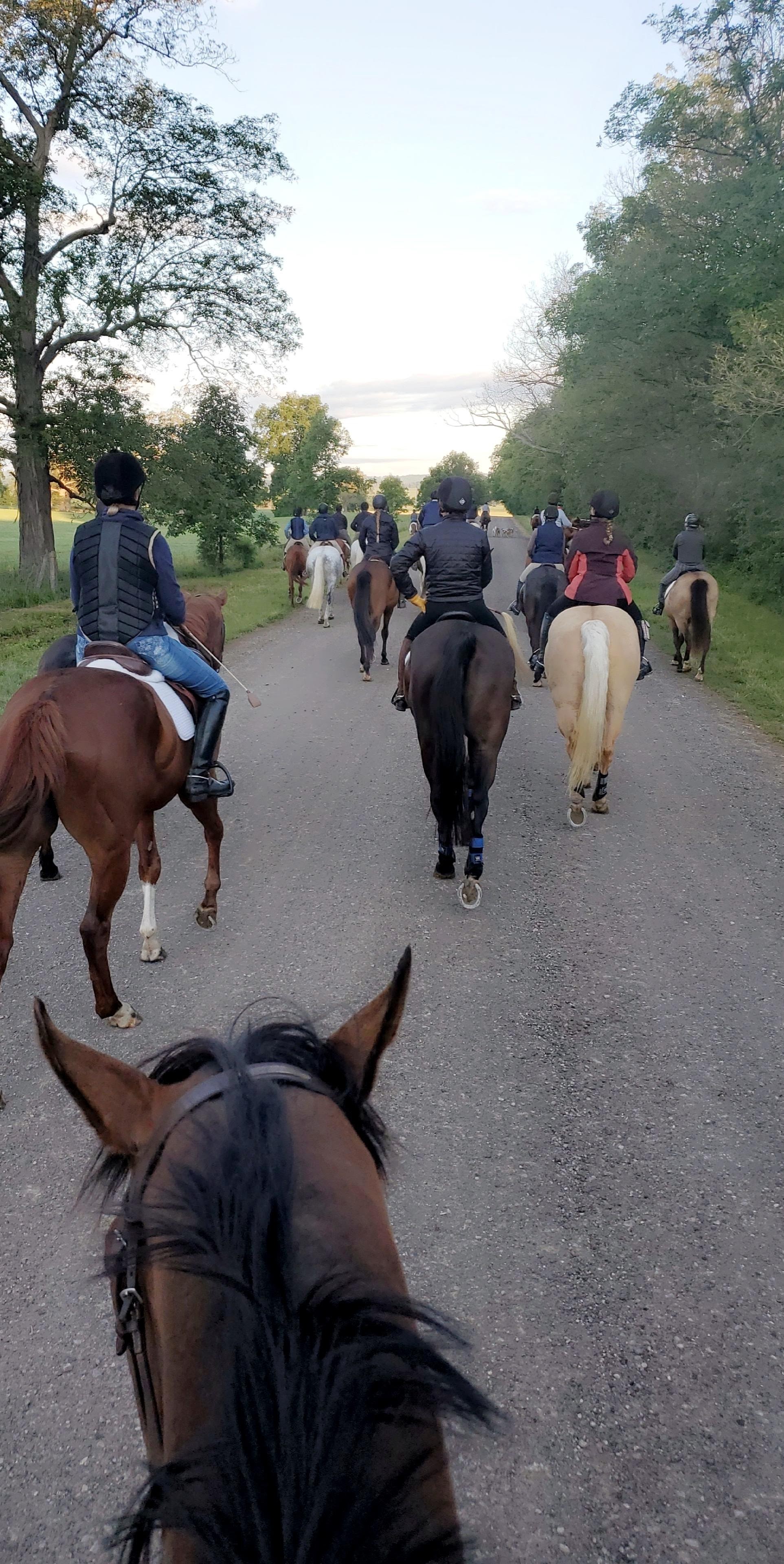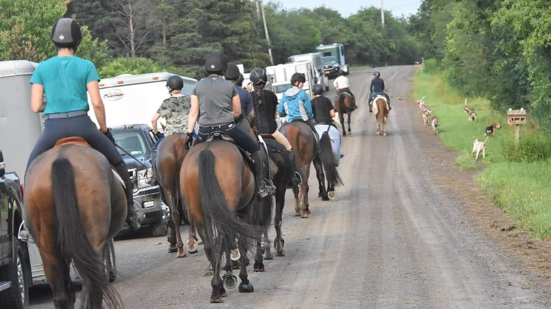 The season starts with “hound-jogging” in late June/early July. During two weeks, all riders are encouraged to go out in the morning and jog with the hunt hounds and staff members. Typically, the riders would meet near the hound’s kennels, and take the hounds up and down nations road. During hound-jogging, all horses and riders are only walking/trotting. This offered a great opportunity to get out new horses (including my own 4 year old thoroughbred), get them used to the hounds, and the rules of the hunt. Some things we had the opportunity to practice included not passing other horses, and “making way” for the field. Hound-jogging is open to anyone in the community who wants to attend – so you do not need to join the hunt to take part.