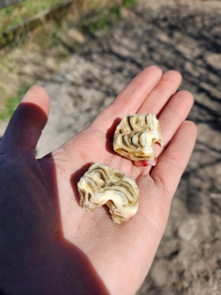 Another fun surprise with young horses is that sometimes during these exams they lose molar caps or, as was the case with my gelding, need a minor extraction. Typically, horses between the ages of 2 ½ and 5 lose about 12 cheek teeth caps, but these tend to shed naturally during the grazing process.