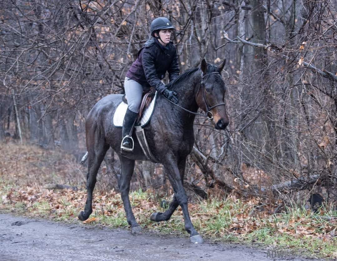 Smirk is a quiet horse and very willing to learn. I have started her slowly and correctly. So far, she has been on many trail rides (working toward her 100 hours of TIP recreational riding), to multiple schooling horse shows, fox-hunted about 20 times with the Genesee Valley Hunt and trailers off-property well. She has had some cross-country schooling experience. She is going nicely walk, trot, canter and over 2′ courses.